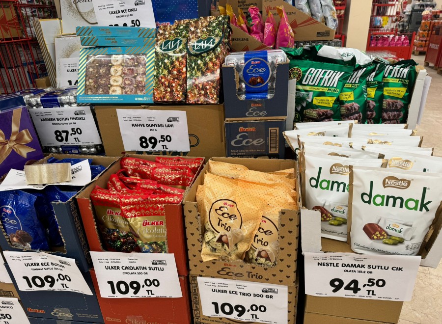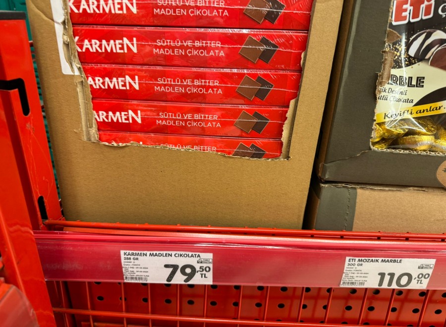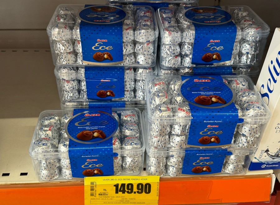 Bayramlarda evlerin en popüler çikolatası olan Ülker Ece çikolatalarının 455 gram fiyat 149 liradan satışa sunuluyor. Evliya dökme çikolata 129 lira, Kent şekerler kilosu 220 lira, Karmen sütlü çikolata 288 gram 79 lira, Çikolatin sütlü 350 gram 109 lira, Buklet madlen çikolatalar 114 lira ve karışık meyveli toffe şekerler 57 liradan satılıyor.
