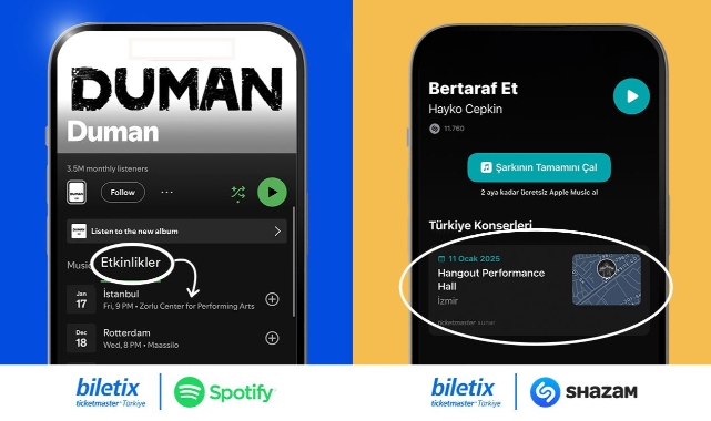 2024 yılında Türkiye'de 15 binden fazla müziksever, Spotify üzerinden dinledikleri sanatçıların konserlerine ait 50 binden fazla bilet satın aldı. Spotify'ın 200'den fazla ülkede 615 milyon kullanıcıya ulaşan platformu sayesinde sanatçılar, dinleyicilerine daha geniş bir alanda ulaşabiliyor.Bu iş birliği kapsamında müzikseverler, Spotify farklı sayfalarından güncel konser bilgilerine ulaşabiliyor ve tek bir tıklamayla bilet satın alabiliyor. Ayrıca Spotify'ın kişiselleştirilmiş e-posta bildirimleri sayesinde sıra kullanıcılar, favori sanatçıların yanı sıra çalma listelerinde yer alan alternatif müzisyenlerin konserlerinden de haberdar oluyor.Sanatçılar ise Spotify for Artists platformu aracılığıyla belirli şehirlerdeki dinleyici ve takipçi sayılarını analiz edebiliyor, bu sayede konser planlamalarını daha etkili bir şekilde yapabiliyor.2024 yılında Duman, Melike Şahin, Mabel Matiz, Kenan Doğulu, Hande Yener, Emre Fel, Mert Demir, Emir Can İğrek ve Maximum Gençlik Festivali, Spotify üzerinden en çok bilet satış etkinlikleri arasında yer aldı.Shazam Entegrasyonuyla Müziğin Büyüsü Sahnelere Taşınıyor