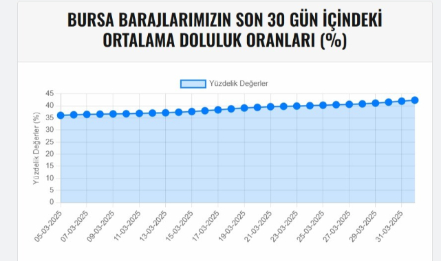 Son 10 yılın en kurak sonbahar ve kış aylarından birini geçiren Bursa’da barajlardaki su oranları endişelendirmeye devam ediyor.Şehrin içme suyu ihtiyacının karşılandığı Doğancı ve Nilüfer Barajlarındaki doluluk oranı yavaş yavaş artış gösterse de geçen seneki oranların çok altında kaldı.Geçen sene Mayıs ayında iki barajın doluluk oranı ortalama yüzde 98.2 iken bu sene Nisan ayına gelindiğinde barajlarda ortalama doluluk oranı yüzde 42.5'i gösteriyor. Son yağışlar ile birlikte Mart ayında su seviyesi yaklaşık yüzde 6 oranında yükselse de yetkililer, vatandaşlara suların tasarruflu kullanılması konusunda uyarılarda bulunuyor.