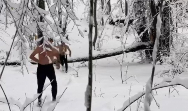 Bursa'da kar yağışı etkili oldu. Uludağ'ın eteklerinin kar tutması sebebiyle ormanlık alanda iki kafadar eğlenceyi zirveye taşıdı. Hava sıcaklığının eksi dereceleri gördüğü Kaplıkaya'da iki arkadaş, yarı çıplak bir şekilde karın tadını çıkardı. İki kafadar yarı çıplak şekilde kara gömülürken, koşarak da spor yaptı.