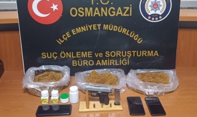Osmangazi İlçe Emniyet Müdürlüğüne bağlı Osmangazi Suç Önleme ve Soruşturma Büro Amirliği ekipleri, uyuşturucu kullanan ve satanlara yönelik çalışmalar kapsamında Akpınar Mahallesi'ndeki bir adresi takibe aldı.Gerekli izinlerin ardından adrese yapılan operasyonda O.E.Ö. yakalandı.Yapılan aramalarda 929 gram uyuşturucu ile ruhsatsız tabanca ve fişekler ele geçirildi.Gözaltına alınan O.E.Ö, işlemleri tamamlanmak üzere Osmangazi Suç Önleme ve Soruşturma Büro Amirliğine götürüldü.