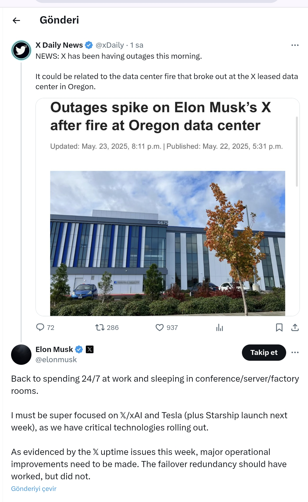 Sosyal medya platformu X'te yaşanan erişim sorunları kullanıcıların tepkisini çekmeye devam ediyor. Platforma dair haberleri paylaşan bir hesap, "Bu sabah X'te kesintiler yaşanıyor. Bu durum, X'in kiraladığı Oregon’daki veri merkezinde çıkan yangınla ilgili olabilir" değerlendirmesinde bulundu. Bu paylaşıma yanıt veren Musk, "Yeniden 7/24 işteyim, konferans odalarında, sunucu odalarında ve fabrika alanlarında uyuyorum. X/xAI ve Tesla'ya (artı gelecek hafta yapılacak Starship fırlatması) son derece odaklanmam gerekiyor, çünkü kritik teknolojiler devreye giriyor. Bu hafta yaşanan X erişim sorunlarının da gösterdiği gibi, büyük operasyonel iyileştirmelere ihtiyaç var. Yedekleme sistemlerinin devreye girmesi gerekirdi ama çalışmadı" sözlerini kullandı.