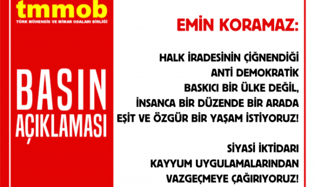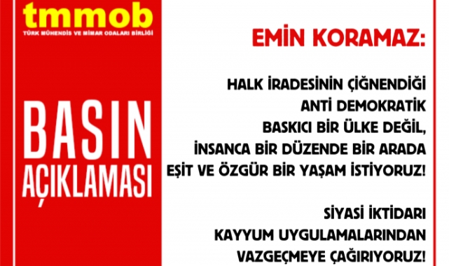 Halk İradesinin Çiğnendiği Anti Demokratik Baskıcı Bir Ülke Değil,İnsanca Bir Düzende Bir Arada Eşit ve Özgür Bir Yaşam İstiyoruz!Siyasi İktidarı Kayyum Uygulamalarından Vazgeçmeye Çağırıyoruz!Esenyurt Belediyesi'nin ardından, Mardin, Batman ve Halfeti Belediyelerine atanan kayyum halk iradesinin nasıl ayaklar altına alındığının en çıplak örneği olmuştur.Biliyoruz ki, muhalif Belediye Başkanlarına yönelik bu uygulamalar hukuki değil, siyasi kararların ürünüdür. Hiç kimsenin ülkemizdeki asgari demokrasi işleyişi yok etmeye, insanların demokratik iradesine ipotek koymaya hakkı yoktur.Ülkemiz ve halkımız halk iradesinin çiğnendiği anti demokratik baskıcı bir geleceği değil, insanca bir düzende bir arada eşit ve özgür bir yaşamı hak etmektedir.Siyasi iktidara bir kez daha sesleniyoruz:Yaşanan bu demokrasi ayıbından, halk iradesine vurulan bu darbeden derhal vazgeçilmelidir.Hukuk dışı yollarla, baskı ve zor yöntemleriyle muhalif siyasetçileri etkisizleştirme anlayışı terk edilmelidir.Siyasi gerekçelerle hukuksuz biçimce cezaevinde tutulan tüm siyasetçiler serbest bırakılmalı, seçilmiş belediye başkanları derhal görevlerine dönmelidir.Ülkenin en acil sorunları olan işsizlik, açlık, güvencesiz bir gelecek, her geçen gün artan borç yükü ortada duruyorken ülkeyi yönetenleri, bu ülkenin gerçek sorunlarıyla yüzleşmeye, anayasaya, hukuka ve halk iradesine saygı duymaya çağırıyoruz.Bu çerçevede siyasi iktidarı kayyum uygulamalarından vazgeçmeye çağırıyor ve halkın iradesine saygı duymaya davet ediyoruz.TMMOB olarak tarihimizin her döneminde antidemokratik ve baskıcı uygulamaların karşısında olduk. Bundan sonra da demokrasiden, özgürlüklerden, halkların kardeşliğinden ve barıştan yana tavrımızı sürdürmeye devam edeceğiz.