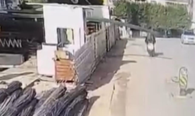 Bursa'da siparişe giden kurye inşaattan yola sarkan demir çubuklara başını çarpıp yola savruldu. O anlar kameraya yansıdı.