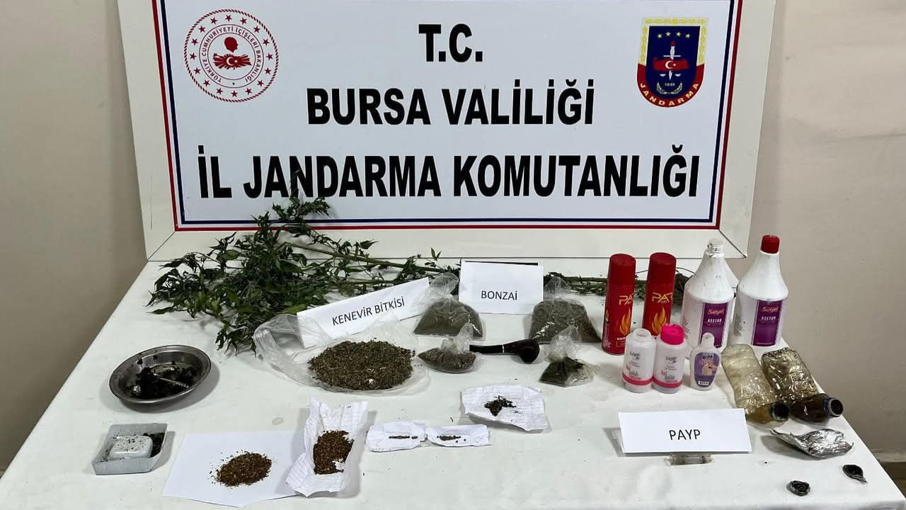 Evde yapılan aramada 411,44 Gram Ağırlığında Bonzai Uyuşturucu Maddesi, 1 Adet Uyuşturucu Madde İçiminde Kullanılan Aparat (PAYP), Bonzai Uyuşturucu Maddesi Yapımında Kullanılan 0.60 Litre Sıvı, 2 Adet Çakmak Gazı, 2 Adet Plastik Şişe İçerisinde A.M. Ve Bonzai Yapımında Kullanıldığı Değerlendirilen 0.20 Litre Sıvı, 1 Adet Uyuşturucu Madde İçiminde Kullanıldığı Değerlendirilen PİPO, Kurutulmaya Bırakılmış 283 Gram Ağırlığında 2 Kök Kenevir İnegöl'de Jandarma Operasyonu: Uyuşturucu İmalatı Yapan Şahıs Tutuklandı