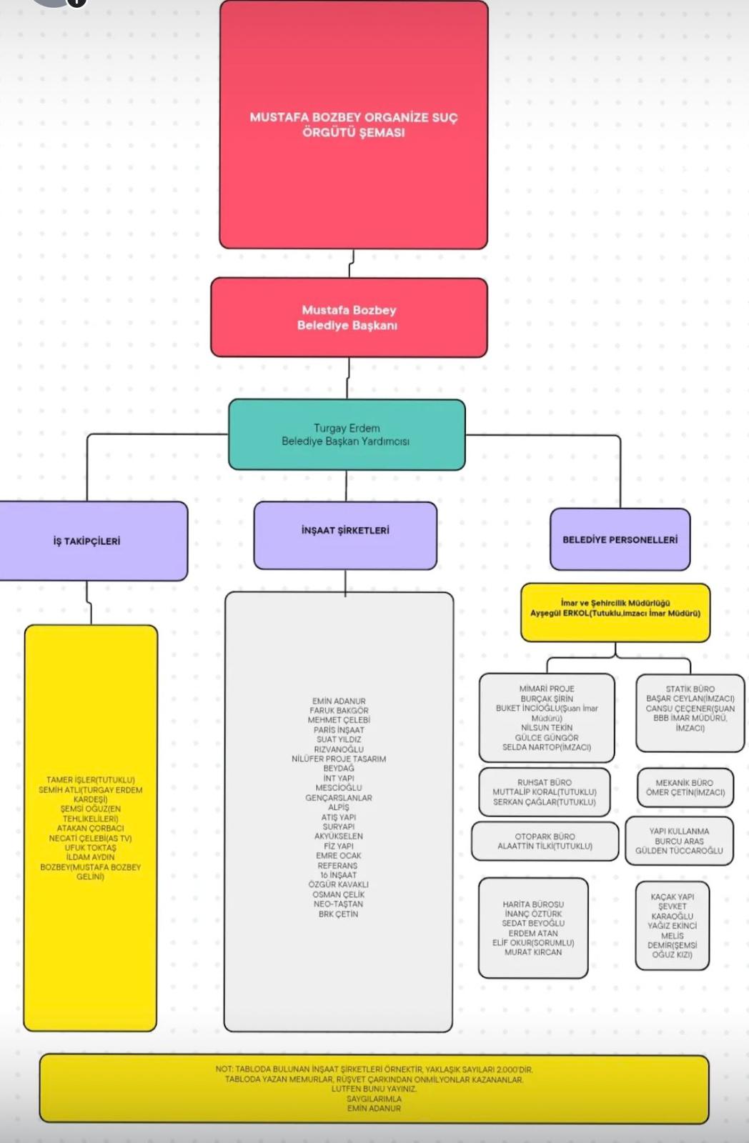 Adanur’un paylaştığı şemada, söz konusu yapının farklı birimlere ayrıldığı, belediye yönetimi, belediye personelleri, iş takipçileri ve çok sayıda inşaat şirketinin yer aldığı görüldü. Şema, ilişkilerin hiyerarşik şekilde gösterilmesi nedeniyle “örgüt şeması” olarak nitelendirildi. Şemada Hangi İsimler Yer Aldı? Paylaşılan tabloda, en üstte “Mustafa Bozbey Organize Suç Örgütü Şeması” başlığı bulunurken, Bozbey’in altında ise dönemin Nilüfer Belediye Başkan Yardımcısı Turgay Erdem ismi yer aldı. Şema üç ana başlık altında toplandı: 1️⃣ İş Takipçileri BölümüBu bölümde Tamer İşler, Semih Alturtay, Semih Özgüzen, Necati Celep gibi isimlerin bulunduğu görüldü. 2️⃣ İnşaat Şirketleri BölümüListede çok sayıda inşaat şirketi ve iş insanı yer aldı. İsimler arasında Emin Adanur, Faruk Bakgör, Suat Yıldız, Nilüfer Proje Tasarım, Beydag, Mescioğlu, Gençarişanlar, Fiz Yapı, Neo-Taştan gibi birçok şirket bulunuyor. 3️⃣ Belediye Personelleri BölümüBu kısımda ise imar müdürlüğü ve ilgili bürolarda görev yaptığı iddia edilen belediye personelleri yer aldı.İmar ve Şehircilik Müdürlüğü’nden tutuklu olduğu iddia edilen isimler ve imza yetkisi olan personeller dikkat çekti.